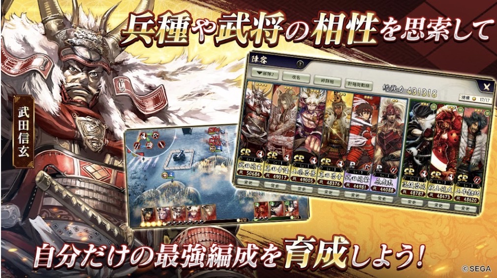 内容はシンプルなものになっており、SEGAの人気作品「戦国大戦」のIPライセンスの監修を受けて作られた戦略型カードRPGだ!