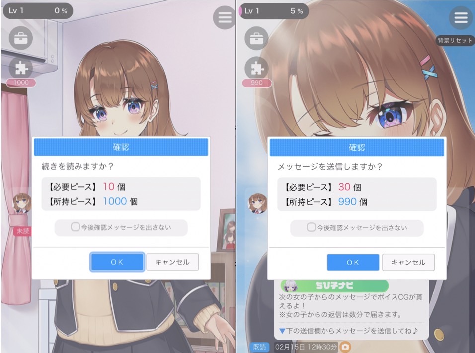 となりのガールフレンドには、無料でゲットできるアオピースと課金をして手に入るニジピースがあります!メッセージの際にはこれらのピースを消費しなければなりません。無料版で楽しむ事が出来るストーリーは出会い編までで、彼女たちと恋人になることができる恋人編では課金が必要になります!