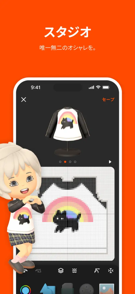 カワイイものが好きな方とかにいちばんお勧めしたいのが、アバター作成です。顔のパーツを組み合わせてリアルの自分自身を投影したり、なりたい理想の自分を思い描いたりと、自由に表現することが可能です。それにスタジオというものがありカスタマイズをする機能です。顔の輪郭や髪型、目の形・色から、ほくろ・そばかすまで含めた細かなデザインはもちろん、洋服、スニーカー、帽子やピアス、バッグまで自由に変えることができ、他の人とは被らないオリジナリティ溢れるアバターの作成が可能です。自分好みのアバターを作り友達と楽しみましょう!!